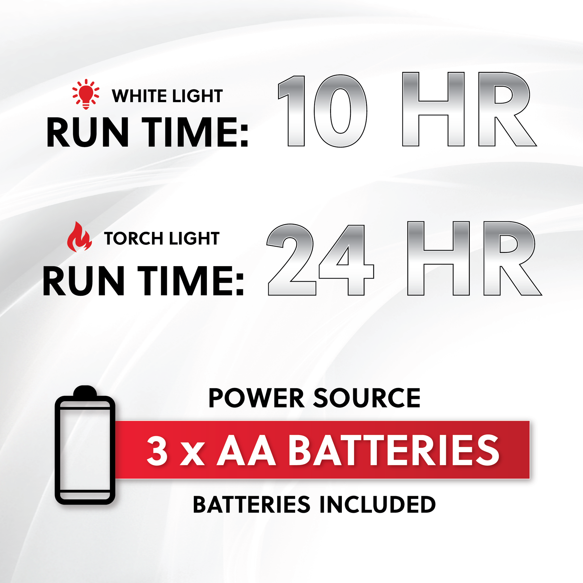 Run Time: White Light: 10 hours, Flame Effect: 24 hours.