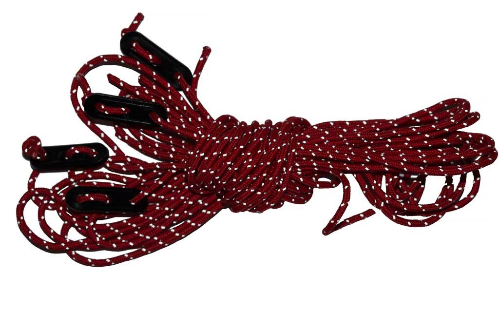 Standard issue with Mons Peak IX tents. Four (4) red reflective 8 ft. / 2.4m long 3mm dia. cords with polymer tensioners. Use for spare or on the second guy line loops on Mons Peak IX tents in rough weather.
